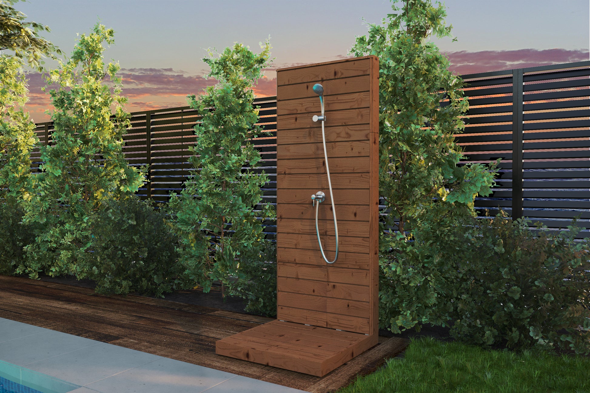 Prysznic VD02 to wolnostojący prysznic ogrodowy w formie słupa z drewna odpornego na warunki atmosferyczne. Stabilna drewniana podstawa i ergonomiczna bateria z słuchawką prysznicową zapewniają komfort użytkowania. Idealny jako uzupełnienie sauny ogrodowej, basenu lub bali.