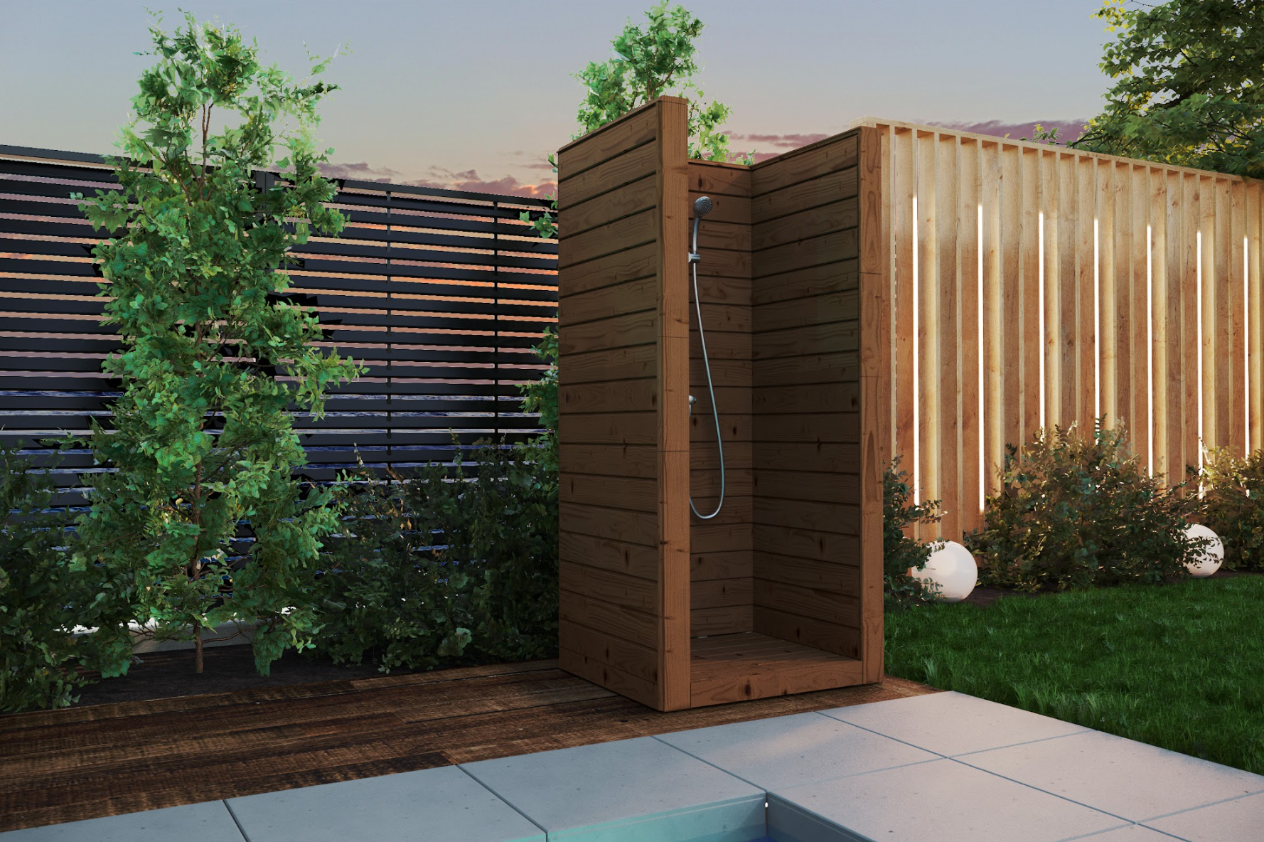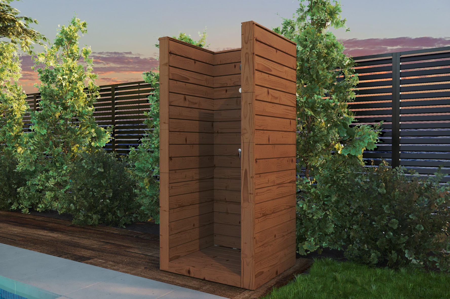 Prysznic VD03 to wolnostojący prysznic ogrodowy w kształcie litery „L" z drewna zabezpieczonego przed wilgocią lub kompozytu premium. Zabudowana konstrukcja zapewnia intymność podczas kąpieli. Idealny jako uzupełnienie sauny ogrodowej, basenu lub bali.