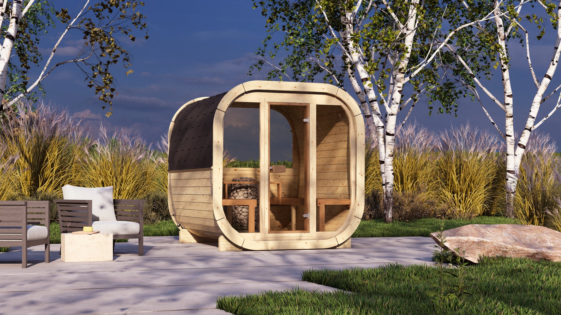 Sauna wymaga stabilnego i równego podłoża, np. płyty betonowej lub tarasu drewnianego. Nie są potrzebne kosztowne prace ziemne ani fundamenty.