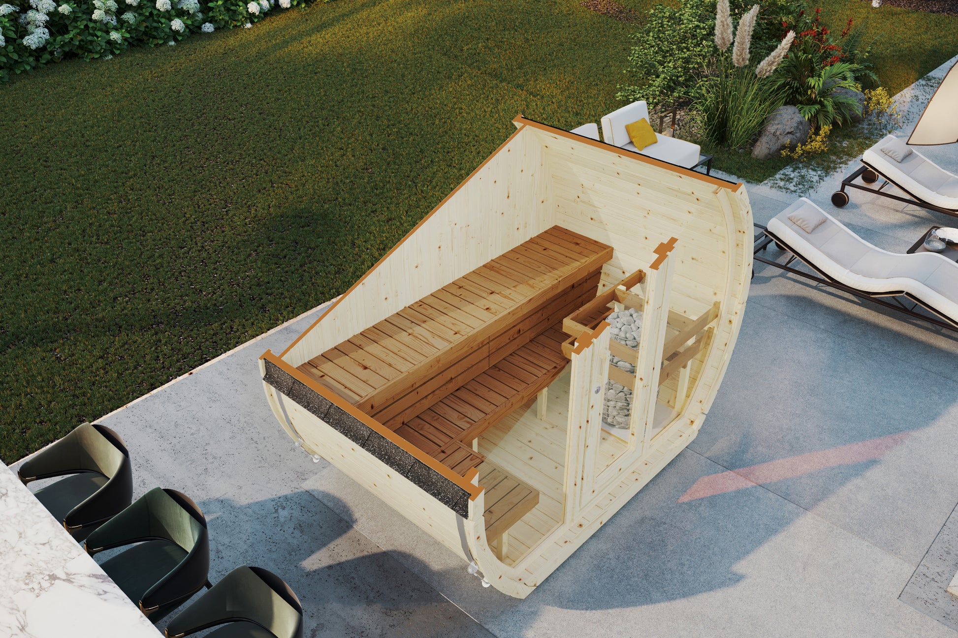 Wnętrze wyposażone jest w ławy z termo-osiki, przystosowane do pracy w wysokiej temperaturze. Model przeznaczony jest dla 2–3 osób.
