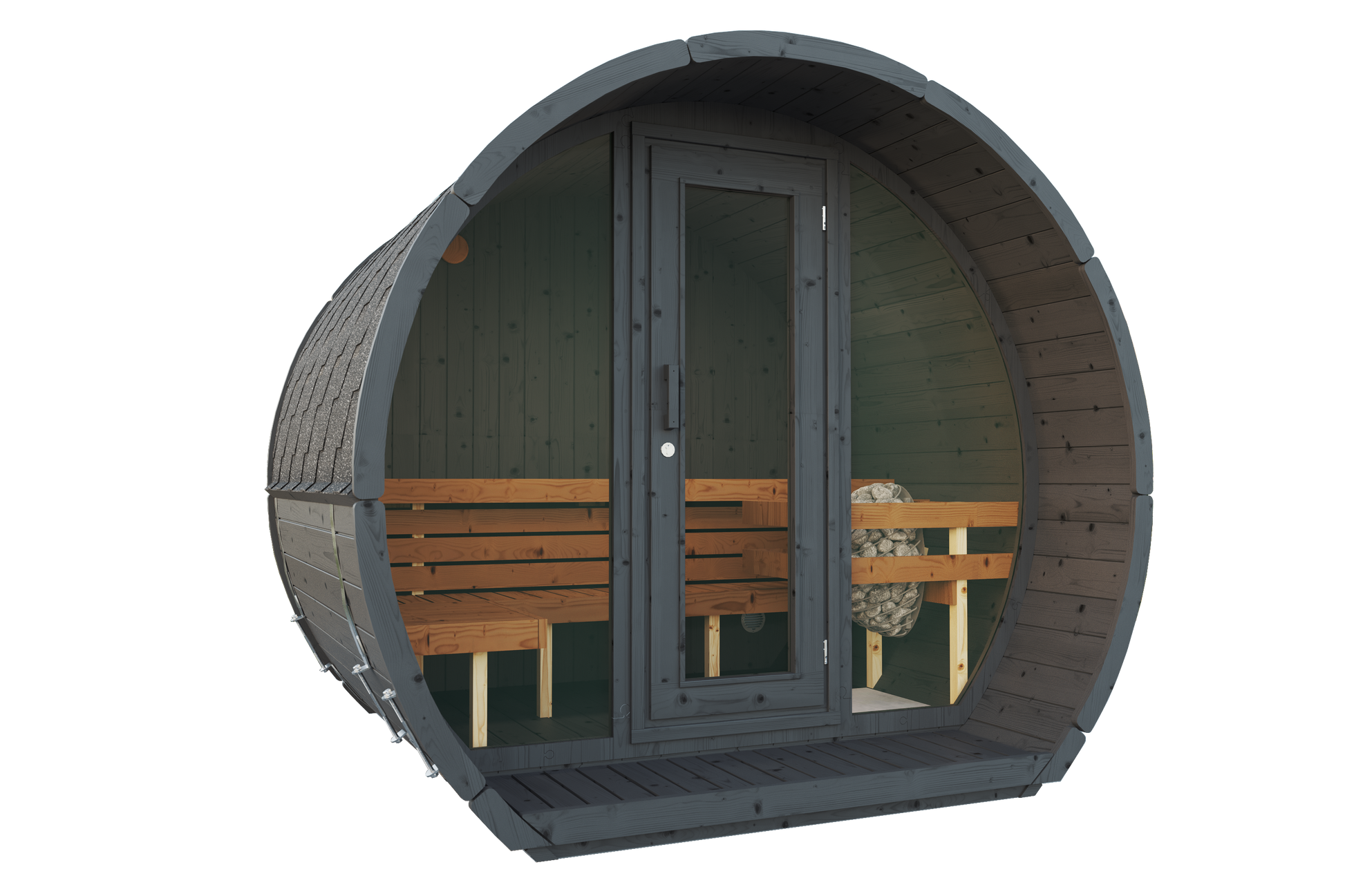 Sauna ogrodowa OSA 200 to model o zaokrąglonym kształcie z przeszklonym frontem, przeznaczony do użytkowania zewnętrznego przez cały rok. Konstrukcja z drewna o grubości 42 mm zapewnia odpowiednią izolację cieplną oraz efektywne nagrzewanie. Dach pokryty gontem bitumicznym chroni przed warunkami atmosferycznymi.